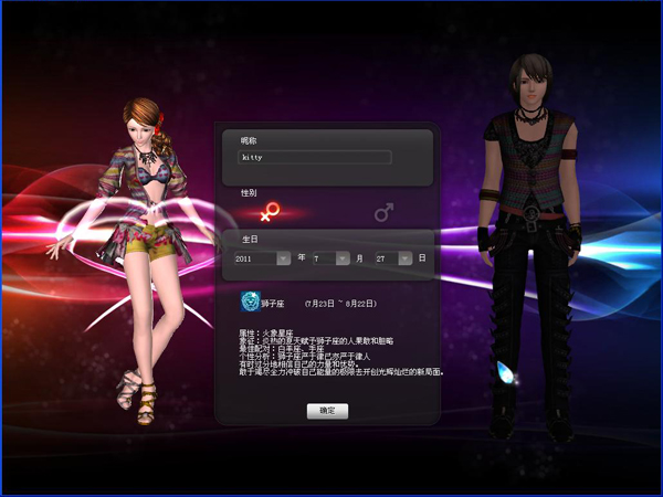 选择频道后创建角色,GG和MM的造型还是很美型的,这里可以选择性别和星座,虽然不知道这个出生日期和星座有什么用处,不过有比没有强,至少也是个性的一种体现。