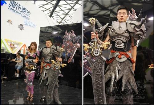 然后去到了腾讯展台,拍到了《轩辕传奇》的一对COS,这个帅锅身上穿的盔甲起码有几十斤,大热的天气拿着这么大的武器感觉挺累的,和旁边的妹子很是般配。其实我是觉得他们的服装和武器都很好,要是头发能再弄一弄就更好看了,战士配一个盔甲女生配个发髻之类的,呼呼,不过整体还是感觉不错!