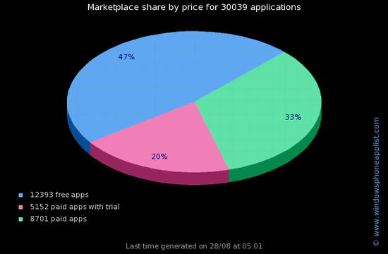 在所有的WindowsPhone7应用程序中,约有47%的WindowsPhone7应用为免费下载产品,其中有20%的应用属于带有免费试用版的付费产品。