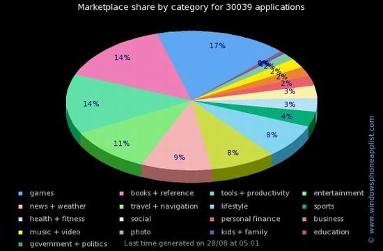 其中,应用市场中最流行的应用种类游戏应用程序占到了应用程序总数的17%,这意味着WindowsPhone7平台目前已经拥有了超过5千款游戏应用。