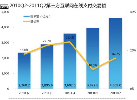 易观国际(Analysys International)研究发现,2011年第2季度中国第三方互联网在线支付市场交易规模继续保持高速增长,与第1季度相比,一方面本季度电子商务类交易有较大幅度的回升;另一方面本季度首批27家支付牌照发放,增强了获牌支付企业发展的信心,也提升了众多传统行业和金融类企业对第三方支付企业的信任度,所以本季度第三方支付企业在面向企业类的支付交易规模也有大幅增加,如保险、教育、基金、物流等行业。