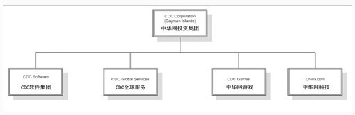 如今的母公司“中华网”底下,有CDC软件、CDC全球服务、CDC游戏和China.com四家子公司。而在整个集团内部,又一共有三家上市公司:即1999年最早在纳斯达克上市的中华网,后更名为现在的“中华网投资集团”(NASDAQ:CHINA)、简称“CDC集团”,2000年在香港上市的中华网(8006.HK)和2009年在纳斯达克上市的CDC软件集团(NASDAQ:CDCS),母公司CDC集团分别拥有79%和85%的股份。