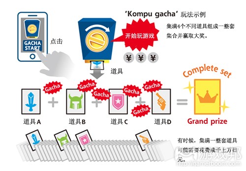 Kompu gacha简称gacha,对玩家进行的是更深层次的物质刺激。玩家并非只是花钱获得额外的道具或商品,kompu gacha还为集齐整套道具的玩家提供丰厚的奖励。据《读卖新闻》报道,集齐整套道具需要尝试数百次,耗费数十万日元。尽管这种机制看上去是种相当良性的激励方案,而且日本社交游戏公司越来越专注于通过kompu gacha来增加盈利,但消费者事务局却发现有关这项机制的抱怨极剧攀升。