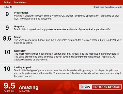 在正式发售整整一周以后,欧美著名游戏媒体IGN今天早些时候放出了暴雪ARPG大作《暗黑破坏神3》的编辑评测及评分:在游戏性和耐玩度方面暗黑3都获得了满分评价,而剧情模式和画面表现则同样获得9分的高分,仅仅在音乐项为8.5分,最终获得9.5分的综合高分。
