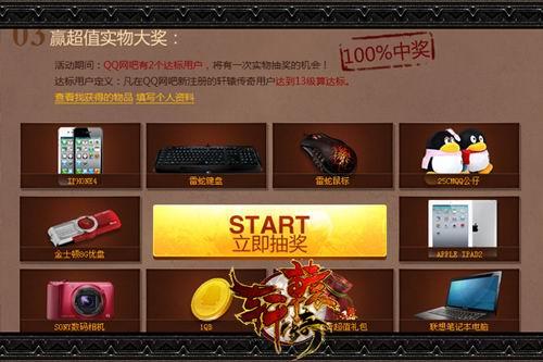 凡在QQ网吧新注册的轩辕传奇用户达到13级,即可列为达标用户。活动期间,只要参与活动的QQ网吧内有2个达标用户,即可获取一次机会,参与超值实物大抽奖,赢取IPHONE、IPAD,联想笔记本,SONY数码相机,雷蛇键盘,雷蛇鼠标,金士顿U盘等数码好礼。百分百中奖HIGH翻天。