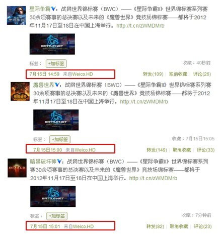 魔兽世界、星际争霸2已经由网易获得国服代理,战网竞标赛消息由这两个官方微博账号发布并无问题,但纰漏出现在,暗黑破坏神官方微博同时发布一模一样的微博,并且,这3条官方微博都由 “weico HD”发布,且间隔时间不足1分钟,内容、链接地址完全一样。而这样3个暴雪产品官博发布同样消息的情况,已经出现过多次。