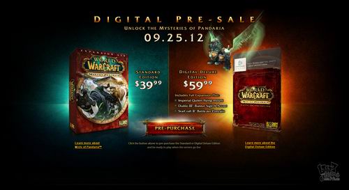 昨天晚间,暴雪娱乐官方网站发布公告,宣布旗下热门MMORPG《魔兽世界》第四个资料片“熊猫人之谜”开始接受预订,并确认了该资料片将于今年9月25日正式更新。目前可以预订的有两种:标准版价格为39.99美元(折合256人民币),包括资料片的升级KEY和常见的盒装版物件;数字典藏版价格为59.99美元(折合383人民币),除了标准版所有内容外,还包括《魔兽世界:熊猫人之谜》中的飞行坐骑魁麟和小宠物魁麟宝宝, 《星际争霸2》的两个战网头像以及《暗黑破坏神3》的独特战旗图样。如果玩家想要实体典藏版则需要在零售店订购,除了数字典藏版的所有内容外,还包括制作花絮CD、资料片音乐CD和精美画辑,以及一张风暴烈酒老陈的主题鼠标垫。售价为79.99美元(折合511人民币)