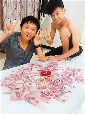 4名犯罪嫌疑人会摆成各种姿势,拿着诈骗得来的金钱拍照,有人把钱拿在手里摆成扇子形状,有人把钱铺在自己的身上或床上,并把照片上传到QQ空间炫耀。 (图片为警方提供)