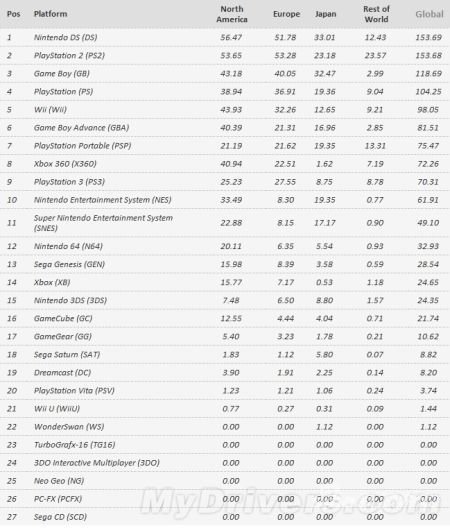 专门监测游戏机硬件、软件销量的VGChartz网站的最新数据显示,DS的全球总销量已经达到1.5369亿部,超越了PS2 1.5368亿部,以1万部的微弱优势登顶历史排名第一。