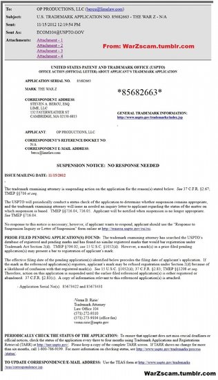 但OP的“War Z”名称的商标注册申请目前已被暂停,因为商标局认为该名和派拉蒙电影公司即将上映的电影“世界大战Z”名字太相似了。(注:僵尸战争(The War Z)英文就是电影The War Z的名字)