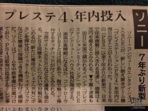 昨天的日本朝日新闻上刊登了一篇关于索尼电子娱乐旗下次时代主机PS4的短篇经济资讯,根据该资讯报道,自2006年PS3发布以后,索尼电子娱乐公司酝酿了7年的次时代主机PS4确定会在今年年内发布,该主机采用了大量全新的科技技术,将重点放在高清晰的游戏画面和SNS社交功能上。该报道还称PS4的售价将高于4万日元(约合2668人民币),根据发行的地区价格有所浮动。(文:17173 晨星)