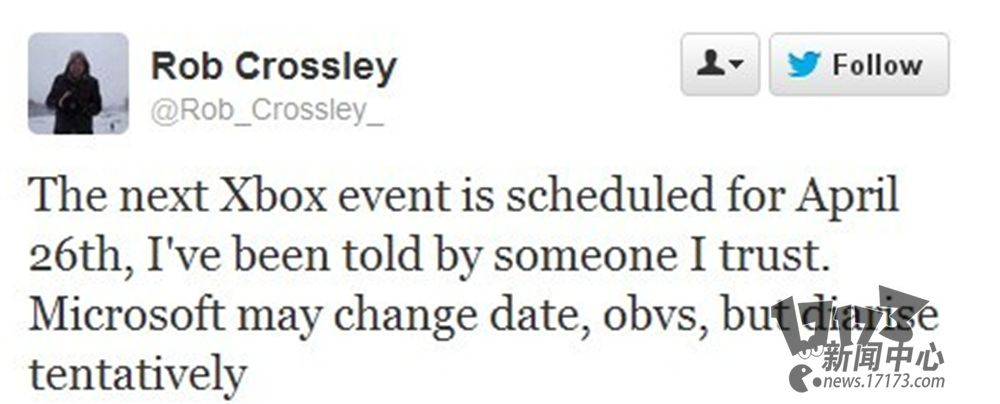 “微软将在4月26号正式发布其下一代主机,我已经将这个消息告诉了我所信任的一些人。当然这只是暂定日期,微软还可能会更改。”