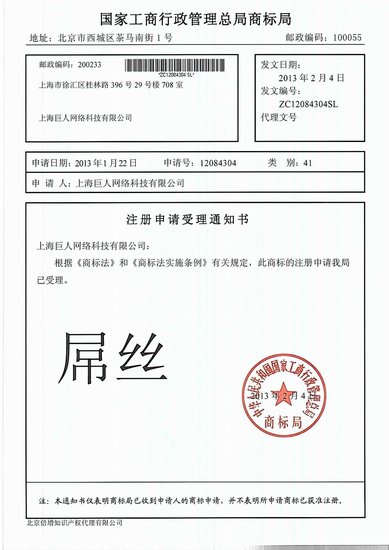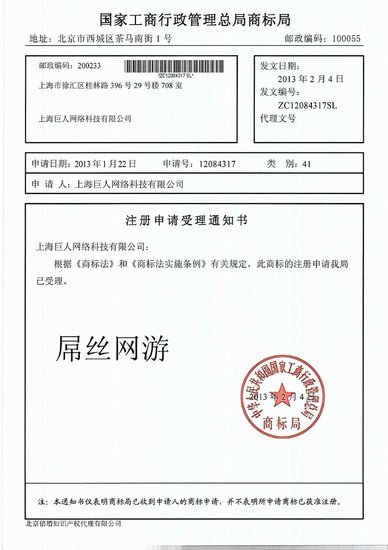 在通知书上可以得知,巨人网络是1月22日申请“屌丝”、“屌丝网游”两个商标,这两个词属于草根网民的自造词,工商部门能否批准这样的词成为合法商标还存疑。对此事的后续报道,腾讯游戏将持续跟踪。