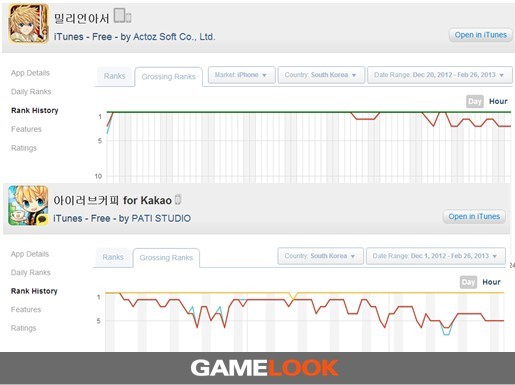 我们来对比下,韩国appstore、及google play收入榜上,《百万亚瑟王》和《咖啡恋人》的相对位置,另需注意,《咖啡恋人》使用了Kakao talk作为发行,而《百万亚瑟王》完全依靠Actoz自己发行。