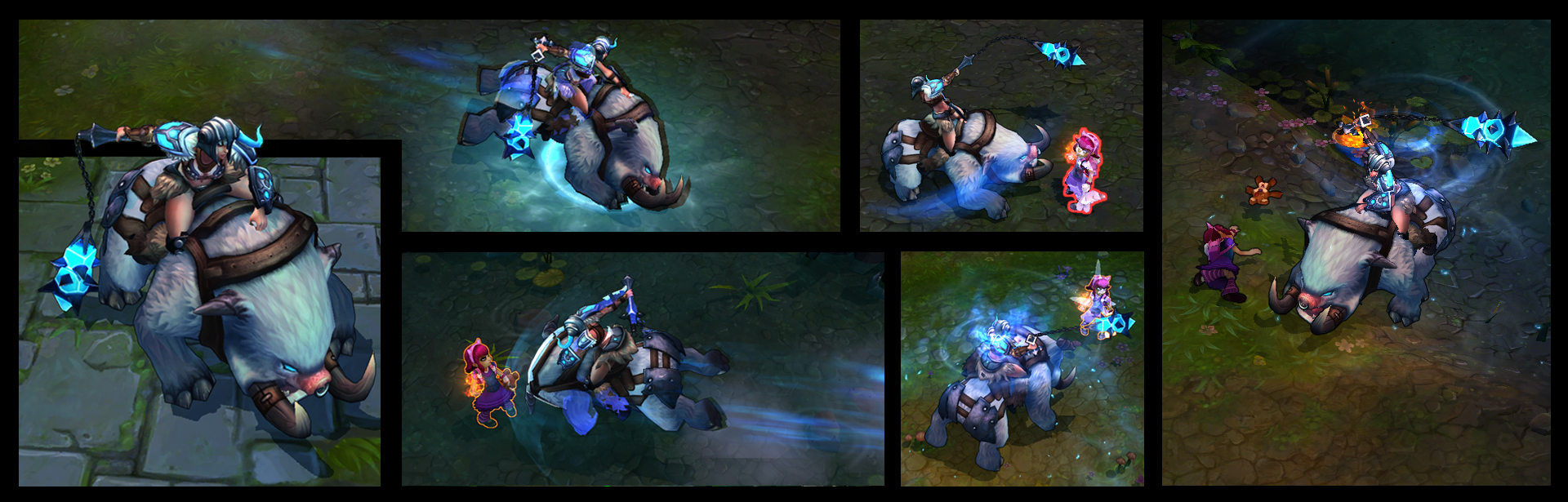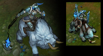 如果我们要让瑟庄妮看起来威风凛凛,我们需要确保她的坐骑—钢鬓的风格也保持一致—凶悍。这里我们增加了它的模型的体积和力量感,并且升级了极寒突袭中它将敌人抛向空中的动画效果。