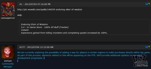 在最新的魔兽世界5.4测试服务器补丁中,有好奇的玩家找到了一个独特的道具持久智慧药水(Enduring Elixir of Wisdom),这个道具能够增加玩家100%的经验获取速度,而道具来源则显示为“游戏内商城”。这位玩家将道具的链接发到了官方论坛上,暴雪社区经理Zarhym随后在跟帖中回复:“我们目前正在讨论增加一种玩家可以直接在游戏中进行购买的方式,而作为这个计划的一部分,一些相关道具会尝试性的出现在测试服务器中,我们会在之后给予玩家更详细的说明。”