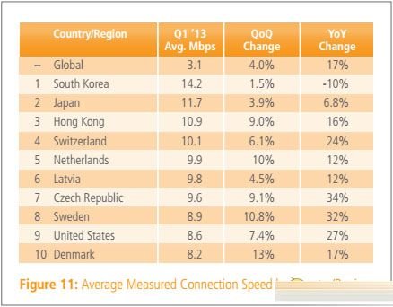 韩国的互联网网速仍在全球排名第一,达到14.2Mbps,尽管环比下降了10%,但环比增长1.5%。日本和中国香港排在二、三位,网速分别为11.7Mbps(环比增长3.9%,同比增长6.8%)和10.9Mbps(环比增长9%、同比增长16%)。排在第三至十位的分别是瑞士、芬兰、拉脱维亚、捷克、瑞典、美国和丹麦。中国网速为1.7Mbps。