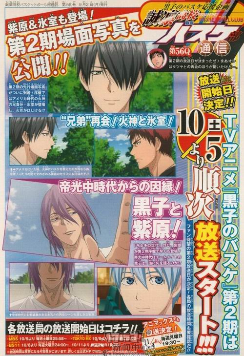 在最新一期《JUMP》上公开了《黑子的篮球》第二季的播放时间。《黑子的篮球》第二季将在10月5日深夜1时58分在MBS电视台开播,TOKYO MX、BS11和ANIMAX也会陆续播出。杂志上还公开了第二季动画的先行画面,包括火神与冰室的“兄弟”再会,黑子与紫原帝光中学时代以来的因缘。