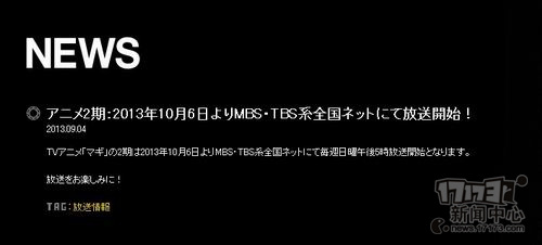 9月4日,《魔笛 MAGI》官网公布了第二季的播放时间。《魔笛 MAGI》第二季将从10月6日起,每周日下午五点在MBS/TBS播出。《魔笛 MAGI》是改编自大高忍创作的超人气同名漫画作品,其中登场人物名字部分取材于《一千零一夜》,舞台是与欧亚大陆和非洲相似的架空世界。故事主要讲述了作为选定世界之王的“魔奇”之一的小主人公阿拉丁的一系列有趣惊险的冒险旅程。