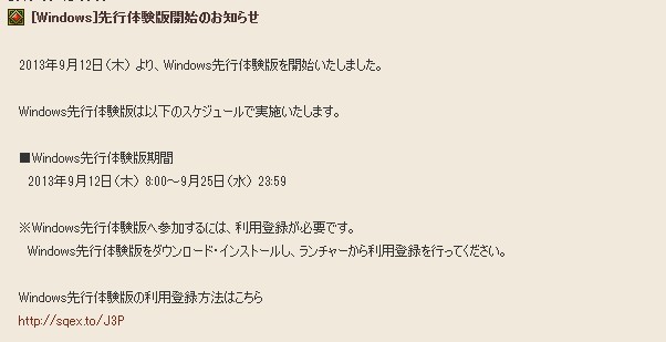 本次的先行体验版为免费试玩版本,虽然未开放全部内容,但能玩到正式版中基本的一些内容。玩家在先行体验版中创建的角色资料在正式版中可以继承使用,PC版的服务器与Wii/Wii U版相同。体验版可以试玩的最高角色等级为20级,职业等级最高为9级。