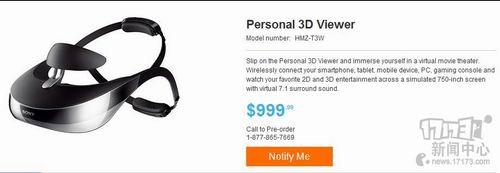 索尼最新的头戴式无线3D装置HMZ-T3W日前开始在索尼官方商城接受预订,售价为999美元,约合6130人民币。该头戴式3D装置通过高清多媒体接口(HDMI)兼容PC、主机、平板电脑和智能手机,并使用了索尼最新的第三代OLED双屏技术。该装置在人体工学上做了一些改进,使用了更灵活的头带固定和较轻的材质,附带的电池可以持续三个小时,同时还支持7.1环绕立体声。