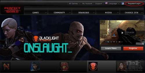 前期工序准备妥当后,首先你需要注册一个完美北美账号,这个账号和你的国服完美账号是不通用的。首先来到完美北美官方网站(点此),点击上图右上角红圈处的注册/登陆按钮,在跳出来的小窗口中选择红色的Register Now。