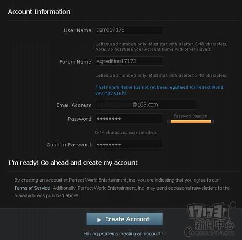 在接下来的注册页面中,从上往下依次填写用户名、论坛名、邮箱地址、密码和确认密码。注意,用户名和论坛名都必须是3-16位的数字或英文字母,不能相同,且必须以英文字母打头。完成后还要再确认一次,这时候选择右侧的浅蓝底色Create Account即可,之后点击Download Games开始下载游戏。