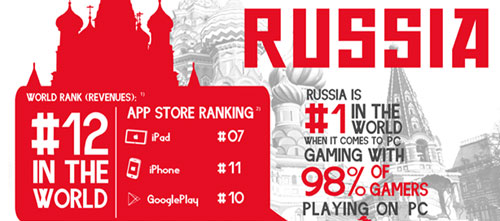 就全球游戏收入而言,俄罗斯目前排名第12位,拥有全球PC游戏最高市场份额比例。在俄罗斯4640万的玩家中,98%的玩家都偏爱于PC端游戏。游戏类型为社交网络游戏,AAA级游戏下载以及在线MMO游戏。俄罗斯目前在手游领域也发展良好,目前位于全球iPad商店排行榜第七,甚至在德国之上。俄罗斯手游玩家主要在重度游戏中消费。