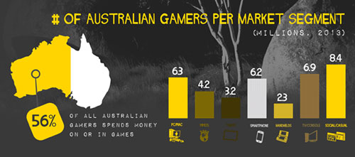 就iPad游戏平均付费值而言,澳大利亚排名全球第一。澳大利亚尽管只有200万平板游戏付费玩家,但是其玩家比全球其他国家玩家在游戏上的平均消费值更高,位于iPad全球排行榜第4位。就游戏收入而言,澳大利亚位于全球第14。1110万玩家中,有56%的玩家为游戏付费。