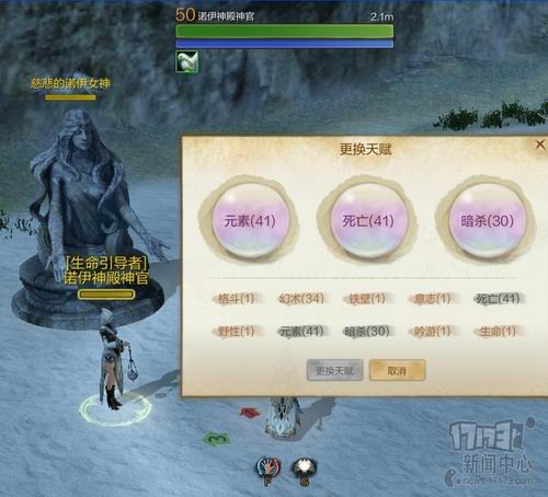 玩家可以任意选择其中三种天赋并获得很酷的职业称号,譬如选择了元素、死亡和生命则成为地狱魔导师、选择野性、暗杀、意志则是天鹰游侠,总计有120种不同的职业搭配。而只需要支付少量金币,你随时可以在天赋管理员或是复活点更换自己的天赋,并成为新的职业。被替换下来的天赋会保留你所练到的等级,而新天赋将从10级开始获得经验。也就是说,如果你有心你可以把所有的天赋都练到满级,并且根据团队或是PVP需要随意切换(当然,你还要准备几套装备)。