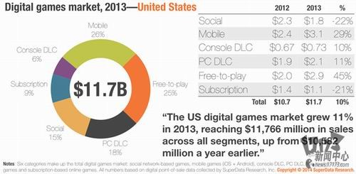 美国市场数据调研机构SuperData日前公布了一份报告,报告称2013年数字游戏市场增速加快,仅美国数字游戏市场规模就已经扩大到117亿美元(约707.8亿人民币),对比2012年增幅达到11%,其中2013年十二月数字游戏的销售额对比2012年更是激增了36%。数字游戏市场的扩张主要来自移动平台(智能手机、平板电脑等)和免费游戏,其中移动平台市场达到36亿美元(约217.8亿人民币),占数字游戏市场的26%;免费游戏则占25%,对比去年增长了45%,接下来依次是PC游戏的可下载内容(DLC)、社交游戏、付费游戏和主机游戏的可下载内容。