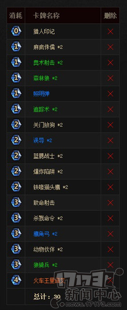 3费:鹰角弓X2、动物伙伴X2、致命射击X1、杀戮命令X2、狼骑兵X2