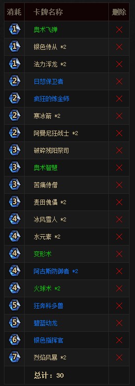 法力消耗 4:冰风雪人*2 水元素 *2 变形术*1 阿古斯防御者*2 火球术*2