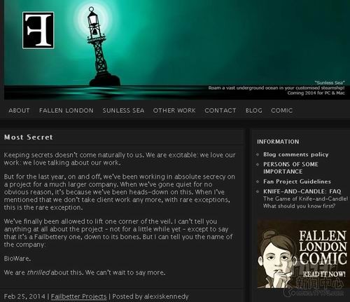 英国互动娱乐工作室Fallen London今天早些时候公布了一项和EA旗下著名游戏开发工作室Bioware的合作项目,在公告中公司创始人亚历克西斯·肯尼迪(Alexis Kennedy)表示:“保密工作对我们来说并不常见,但在过去一年中我们却不得不缄口不言。我们一直致力于一个大项目的开发,而今天,这个项目终于能够揭开面纱的一角。我们和一个大公司有一个项目合作,这个项目汇聚了来自双方优秀的设计师,我们对此兴奋不已,这家公司是---Bioware。”
