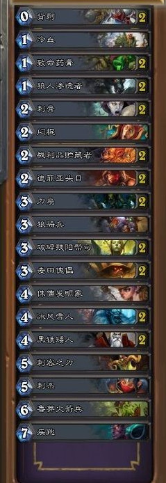 卡牌战术:开场手牌留3费以下随从和【背刺】,先手且没有【背刺】时不要留【迪菲亚头目】前期利用盗贼本人能装备武器,并且能给武器上【致命药膏】,并利用【背刺】清理对方随从,拍下自己的随从中期利用【刺骨】,【残阳破碎祭祀】可以给队友增加属性的特点,配合【冰封雪人】【麦田傀儡】【黑铁矮人】来占据场上主动利用【刺杀】【闷棍】秒杀对方的【嘲讽】随从后,给【冲锋】随从加上【冷血】终结对手,适时利用【疾跑】补充手牌