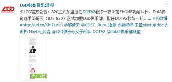 就在刚刚LGD俱乐部官方微博发表公告“前EHOME功勋队长、DotA传奇选手邹倚天(ID:820)正式加盟LGD俱乐部,担任DOTA2教练一职”。在2014年年初,820就做为LGD战队教练随队远赴拉斯维加斯参加D2L总决赛并带领LGD战队夺得冠军,直至今天LGD俱乐部才正式发出公告。