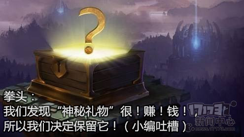 Riot:玩家们都表示非常喜欢神秘礼物,因此我们打算将神秘礼物赠礼活动永久保留。从现在起,玩家们可以在赠礼中心为好友赠送神秘皮肤和神秘英雄。