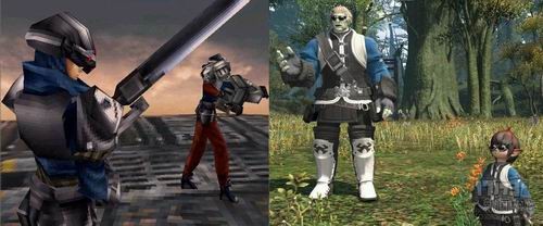 主线故事进行到中段,玩家会接到任务去营救一艘遭到帝国袭击坠毁的飞空艇,飞空艇的驾驶员是比格斯(Biggs)和威吉(Wedge)。这两个活宝早在FF4和FF6中就作为杂兵出场,FF7中则担任走过场的龙套同伴,到了FF8才有较多戏份,他们俩和希德在FF14主线中有着非常高的出场率,也给我们带来许多欢乐。顺带一提,坠毁的飞空艇叫“小野马号”(The Tiny Bronco),是FF7中希德的小飞机。上图中左侧为FF8电波塔剧情中的比格斯和威吉,右侧则是FF14中的。