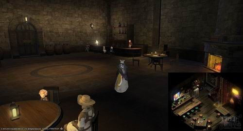 在后期高级区域莫多娜(Mor Dhona),有一家酒馆叫“第七天堂”(The Seventh Heaven),和FF7中蒂法所开的那家酒馆同名,里面的布置也相当接近,这里应该还有一些隐藏的细节(店主对话和客人)值得考证,希望国服开了后有人去考据。上图可以看到两者的主吧台和整体布置很接近。