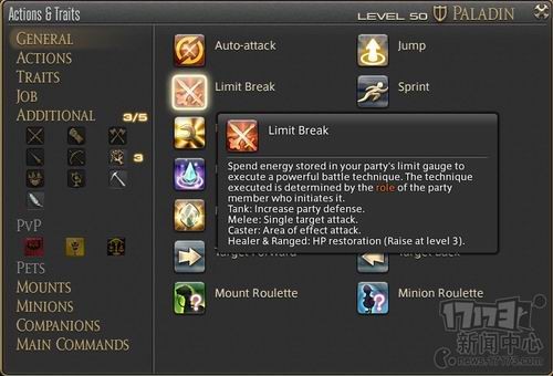 副本中组队状态下受到伤害积累怒气可以使用“极限技”(Limit Break),怒气累计的图标和模式出自FF7同名系统,当担任DPS的玩家使用极限技时(限近战),会看到自己挥舞着克劳德的招牌巨剑(Buster Sword)。因为笔者是坦克,所以也没机会截到使用的图……