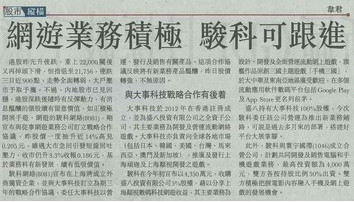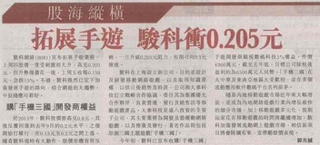 在**的报道中了解到,骏科网络讯息宣布拓展手游业务后,上周四股价一度受刺激而大升,高见0.205元,但升势仅昙花一现,上周五收报0.158元,急跌15%。不过,骏科既然已定下加强发展手游的路向,迎合网游的大趋势,中长期应可看好。