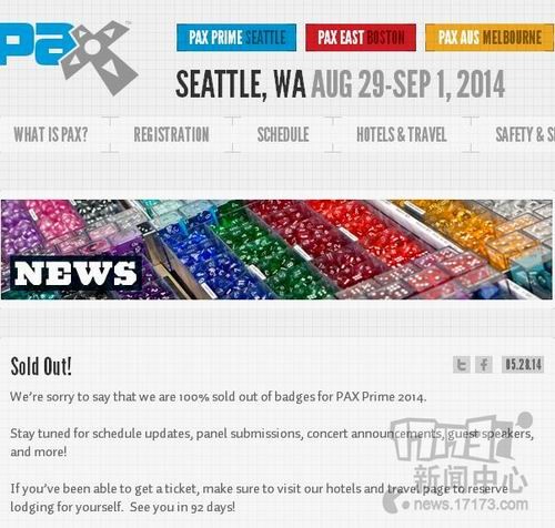 将于今年8月29日至9月1日在美国波士顿举办的PAX Prime游戏展门票北京时间今天凌晨开始销售,然而仅仅过去不到一个小时时间,销售页面上的门票就被抢购一空。官方网站随即发布公告确认了“所有”预售的门票都已经卖光,并对期待参加今年PAX Prime却没有抢到门票的玩家表示歉意,同时表示届时在游戏展现场还会有一些门票销售。