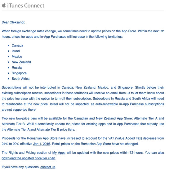 苹果近日向开发者发出通知,由于汇率变动,未来72小时内苹果公司将上调加拿大、俄罗斯、新西兰、以色列、墨西哥、新加坡及南非App Store的内容,包括应用售价、应用内购等内容。