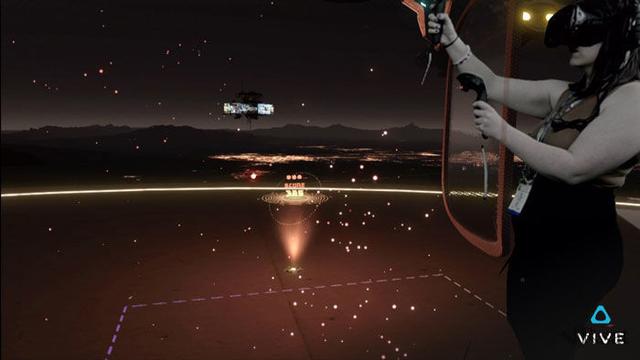 在 E3 展上 HTC 布置了这个绿屏技术的演示版,使用《太空海盗教练》作为演示内容,值得一提的是,任何在 HTC Vive 上的VR体验都可以输出MR视频。在绿屏技术的帮助下,玩家仍然像往常一样玩游戏,他们射击这些攻击自己的敌人,躲闪子弹以免击中自己,而这一切,玩家不再是看到自己傻乎乎的凭空耍动作,取而代之的是完全与游戏中的场景互动。