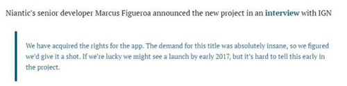 但这并不是说,Niantic在未来不会利用他们的技术来制作这么一款应用,但现在官方并没有公布类似的计划。所有这些《哈利波特》题材游戏都是有一篇刊登在HelloGiggles上的博文引发的,而这篇博文是的来源是一个名为JTHX News的网站。JTHX News的这篇文章一开始听上去很合理,因为引用了IGN对Niantic高级开发者Marcus Figueroa的采访。