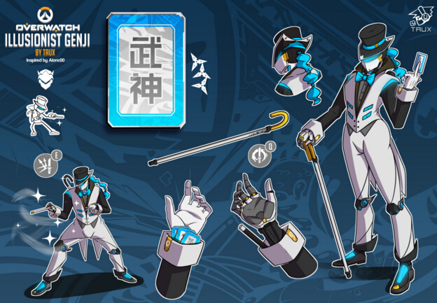 国外玩家设计了源氏的同人皮肤:魔术师。源氏扔的不是飞镖而是卡牌(卡背上书“武神”)!并且神龙剑变成了魔术拐杖,平时隐藏在衣服中,开大了就能瞬间从手中变出来。