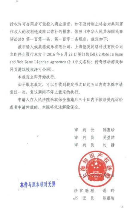 备受关注的游戏《热血传奇》版权归属争议又有了新的进展。近日,上海知识产权法院正式下达民事裁定,要求韩国娱美德公司和上海恺英公司立即停止履行于双方6月28日签订的《热血传奇》授权许可合同。