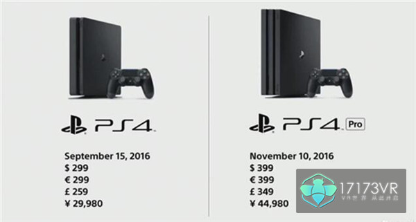 价格来看:PS4 Pro美国售价399美元(约合人民币2660元),日本售价44980日元。将于2016年11月10日发售。PS4 Slim主机将于9月15日正式上市,美国售价299美元(约合1990元人民币),日本售价29980日元。