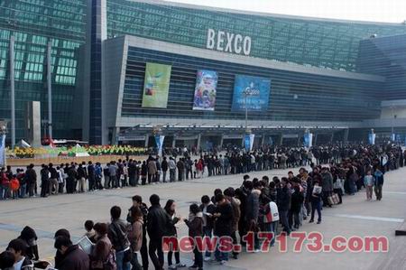 釜山BEXCO外等待入场的观众