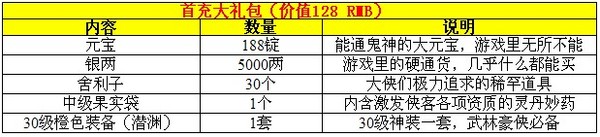 30级蓝装一套、30000银两、50元宝、随机果实*40、精力果实*3、三品藏绿石*30、三品紫英石*10 |
